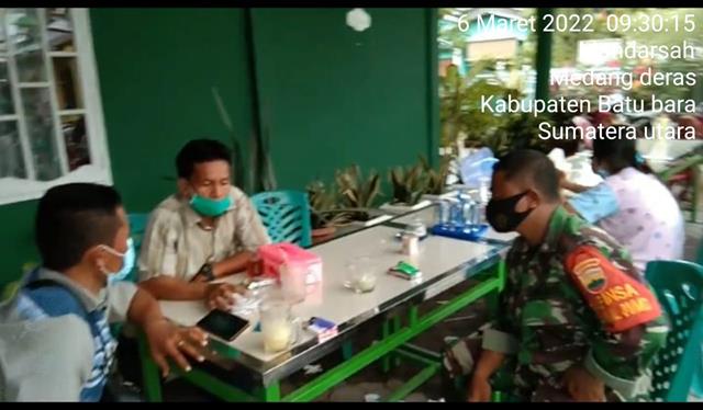 Batu Bara | Agar terjalinnya komunikasi yang baik dengan aparat desa Perbangunan, dalam hal ini seperti yang dilakukan oleh Personel Bintara Pembina Desa (Babinsa) Koramil 01/Medang Deras jajaran Kodim 0208/Asahan Serda Supris turun kewilayah binaan untuk melaksanakan kegiatan Komunikasi Sosial (Komsos) bersama dengan Mitra Karib dan warga desa binaan dalam rangka sosialisasi pendisiplinan protokol kesehatan guna mengurangi penyebaran Covid19 bersama dengan Bapak Sutrisno dan Bapak Darwin, kegiatan tersebut yang dilaksanakan bertempat di Desa Mandarsah Kecamatan Medang Deras Kabupaten Batu Bara, Minggu (06/03/2022).
