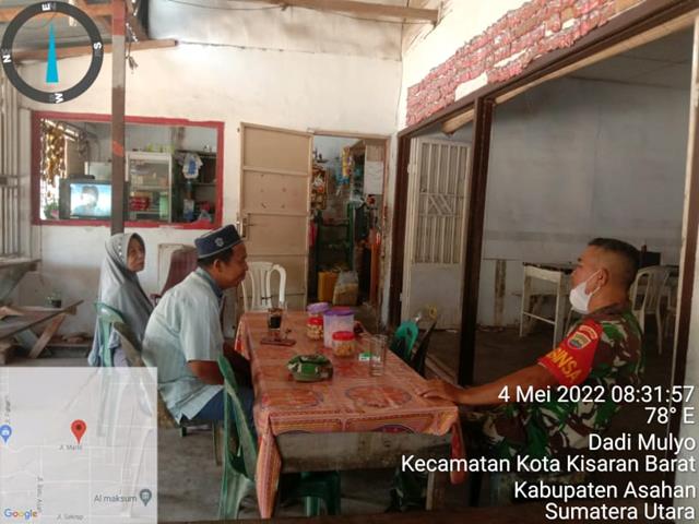 Ashaan  |  Agar masyarakat,dan TNI dapat berbaur,serta terjalin nya kerja sama yang baik antara TNI-masyarakat, dalam hal ini seperti yang dilakukan oleh Personel Bintara Pembina Desa (Babinsa) Koramil 06/Kisaran jajaran Kodim 0208/Asahan Serda Kamaruddin turun kewilayah binaan untuk melaksanakan kegiatan Penggalangan Mitra Karib dan warga menjalin komunikasi dan kerja sama yang baik dan mengingatkan agar tetap mamakai masker apabila keluar rumah dan tetap mematuhi Prokes dengan cara Komunikasi Sosial diwilayah binaan bersama Ibu Tarmini (Pemilik Rumah), Bapak H. Zaini Rambe (Tokoh Agama) dan Babinsa koramil 06/Kisaran dalam rangka menghimbau agar tetap menghimbau masyarakat agar mematuhi protokol kesehatan jaga jarak pakai masker dan cuci tangan agar terhindar dari penularan Covid-19 melaksanakan anjangsana sekaligus berlebaran di rumah B Tarmini, kegiatan tersebut yang dilaksanakan bertempat di Jalan Martil Lingkungan V Kelurahan Dadimulyo Kecamatan Kisaran Barat Kabupaten Asahan, Rabu (04/05/2022).