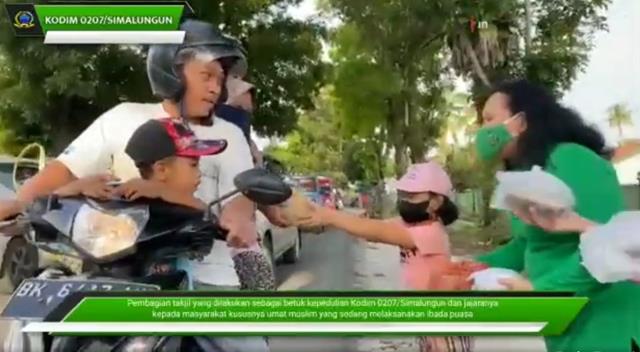 Para pengguna jalan yang melintas di depan Kodim 0207/Simalungun menjelang adzan Magrib disapa dan menerima takjil dari Komandan Kodim (Dandim) 0207/Simalungun, dalam pembagian takjil itu, Dandim didampingi Ketua Persit Kartika Chandra Kirana (KCK) Cabang XXXIV Kodim 0207/Simalungun Ny. Juli Souhoka beserta anggota Kodim 0207/Simalungun serta Pengurus Persit Kartika Chandra Kirana (KCK) Cabang XXXIV Kodim 0207/Simalungun.