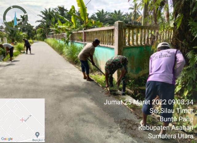 Pada kesempatan yang baik ini menyikapi hal tersebut, seperti halnya yang dilakukan oleh Personel Bintara Pembina Desa (Babinsa) Koramil 13/Buntu Pane jajaran Kodim 0208/Asahan Sertu Toni Suwandi turun kewilayah binaan untuk turut serta melaksanakan kegiatan Gotong royong dalam rangka Jumat Bersih bersama dengan warga desa Binaan dengan melaksanakan kegiatan membersihkan rumput dan membersihkan saluran air yang ada diwilayah binaan tersebut, yang turut serta dihadiri oleh Kadus ll B Bapak Wanda, kegiatan tersebut yang dilaksanakan bertempat di Dusun ll B Desa Sei Silau Timur Kecamatan Buntu Pane Kabupaten Asahan, Jumat (25/03/2022).