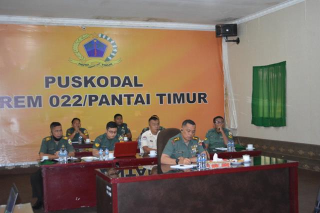 Pematang Siantar | Komandan Korem (Danrem) 022/Pantai Timur Kolonel Inf Luqman Arief, S.I.P., yang diwakilkan oleh Kepala Seksi Rencana Korem 022/Pantai Timur Letkol Kav A.R Dalimunthe, S.E., turut serta mengikuti Video Conference dalam rangka Rapat Evaluasi Sistek Info TNI AD Sem I TA 2022 kepada seluruh Operator Sisfo (Pers, Log, Ren dan Audit), kegiatan tersebut yang dilaksanakan bertempat di Ruang Puskodal Korem 022/Pantai Timur Jalan Asahan Km, 3.5 Nagori Siantar Estate Kecamatan Siantar Kabupaten Simalungun, Kamsi (21/07/2022).