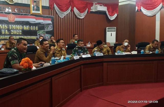 Pematang Siantar  |  Melalui Video Conference, TNI AD kembali menggelar Rapat Koordinasi Teknis (Rakornis) TNI Manunggal Membangun Desa (TMMD) Reguler ke-114 Tahun Anggaran 2022. Dalam hal ini Komandan Korem 022/Pantai Timur Kolonel Inf Luqman Arief, S.I.P., yang diwakilkan oleh Kepala Seksi Teritorial Korem 022/PT Mayor Inf Fahroel Muhadi turut serta mengadiri pelaksanaan kegiatan Rakornis TMMD Ke-114 TA. 2022, yang mengusung Tema ” TMMD Dedikasi Terbaik Membangun NKRI ” dengan secara Vidcon, kegiatan tersebut yang dilaksanakan bertempat di Kantor Bupati Labusel Lantai II Ruang Rapat Command Center Smart Regency, Jalan Lintas Sosopan Kecamatan Kota Pinang Kabupaten Labuhan Batu Selatan, Selasa (19/07/2022).