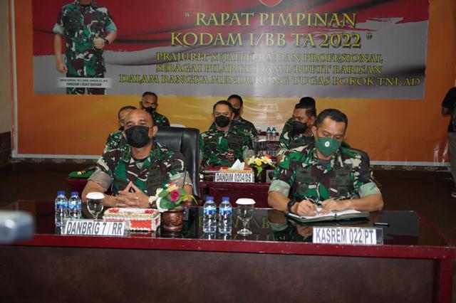 Selanjutnya Pangdam menyampaikan bahwa Rapim Kodam I/BB TA. 2022 merupakan tindak lanjut dari Rapim TNI dan Rapim TNI AD yang telah dilaksanakan beberapa waktu lalu untuk menjabarkan pokok-pokok kebijakan Panglima TNI dan Kasad pada TA. 2022, yang nantinya akan diturunkan menjadi pokok-pokok kebijakan Pangdam I/BB pada TA. 2022, sebagai pedoman dalam rangka pelaksanaan dan pencapaian tugas selama satu tahun ke depan.