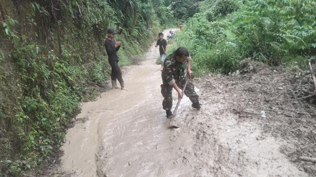 Simalungun | Jaga keselamatan pengguna jalan diwilayah binaan, dalam hal ini seperti yang dilakukan Personel Bintara Pembina Desa (Babinsa) Koramil 09/Tiga Balata jajaran Kodim 0207/Simalungun Serma Wasinton Purba bersama 4 orang Babinsa Koramil 09/Tiga Balata turun kewilayah binaan untuk melaksanakan kegiatan Gotong royong dengan sasaran pembersihan longsoran tanah yang menutupi badan jalan, kegiatan tersebut yang dilaksanakan bertempat di Dusun V Nagaulambu Nagori Dolok Parmonangan Kecamatan Dolok Panribuan Kabupaten Simalungun, Kamis (17/03/2022).