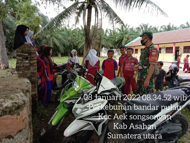 Asahan | Untuk mendukung kegiatan belajar mengajar dan memastikan menerapkan protokol kesehatan untuk mencegah dan memutus rantai penyebaran Covid-19, seperti halnya yang dilakukan oleh Personel Bintara Pembina Desa (Babinsa) Koramil Koramil 15/Bandar Pulau jajaran Kodim 0208/Asahan Sertu Irwan Bustomi turun kewilayah binaan untuk melaksanakan kegiatan Komunikasi Sosial (Komsos) bersama para guru dan anak anak Sekolah SD Negeri 010134 di desa binaan dalam rangka guna untuk mensosialisasikan kepada mereka bahwasanya jangan takut untuk di vaksin, karna vaksin itu tidak sakit melainkan untuk memperkuat imun tubuh kita, agar tidak tertular oleh virus Covid-19 bersama Para guru-guru, kegiatan tersebut yang dilaksanakan bertempat di Sekolah SD Negeri 010134 tepatnya di Dusun 2 Desa Perkebunan Bandar Pulau Kecamatan Aek Songsongan Kabupaten Asahan, Sabtu (08/01/2022).