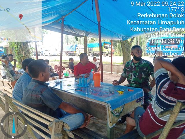 Batu Bara | Hal ini dilakukan guna mempererat tali silaturahmi dan kerja sama yang baik dalam rangka mendukung tugas pokok Babinsa serta terwujudnya Kemanunggalan TNI dengan rakyat, dalam hal ini seperti yang dilakukan oleh Personel Bintara Pembina Desa (Babinsa) Koramil 03/Lima Puluh jajaran Kodim 0208/Asahan Serda Suyadi turun kewilayah binaan untuk melaksanakan kegiatan Komunikasi Sosial (Komsos) bersama dengan Tokoh Pemuda Bapak Toher dan Kaur Desa dalam rangka untuk membahas tentang keamanan masyarakat agar tepat aman dalam melaksanakan aktivitas di luar rumah, kegiatan tersebut yang dilaksanakan bertempat di Desa Perkebunan Dolok Kecamatan Lima Puluh Kabupaten Batu Bara, Rabu (09/03/2022).