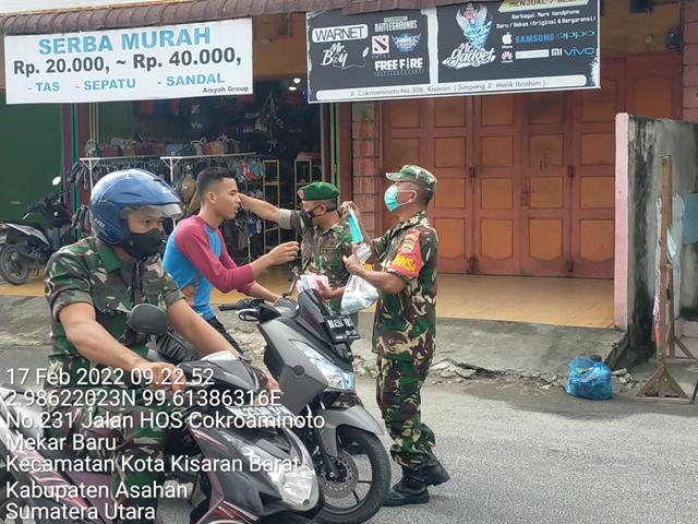 Asahan  |  Guna memutus mata rantai penyebaran Virus Covid 19 di wilayah Kisaran, dalam hal ini seperti yang dilakukan oleh Komandan Koramil (Danramil) 06/Kisaran Kapten Inf Algi Fahri bersama dengan para Personel Bintara Pembina Desa (Babinsa) Koramil 06/Kisaran jajaran Kodim 0208/Asahan turun kewilayah binaan untuk melaksanakan kegiatan Pembagian Masker dalam rangka mencegah penyebaran virus Covid-19, kegiatan tersebut yang dilaksanakan bertempat di Jalan Cokroaminoto (Depan Imam Market) Kelurahan Mekar Baru Kecamatan Kisaran Barat Kabupaten Asahan, Kamis (17/02/2022).
