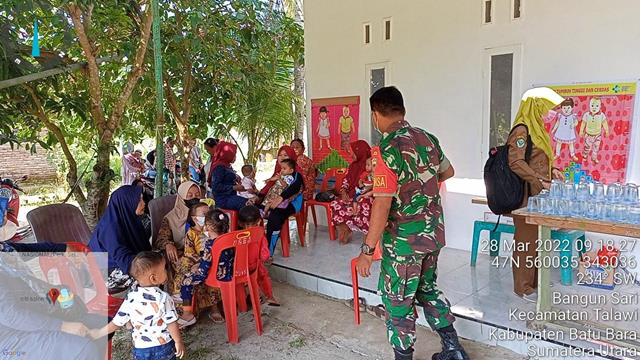 Batu Bara | Posyandu adalah wadah pemeliharaan kegiatan kesehatan dasar yang diselenggarakan dari, oleh dan untuk masyarakat yang dibantu oleh petugas kesehatan dengan maksud dan tujuan Posyandu itu sendiri antara lain untuk menurunkan angka kematian bayi (AKB), angka kematian ibu hamil, melahirkan dan nifas meningkatkan peran serta masyarakat untuk mengembangkan kegiatan kesehatan, dalam hal ini seperti yang dilakukan oleh Perseonel Bintara Pembina Desa (Babinsa) Koramil 05/Tanjung Tiram jajaran Kodim 0208/Asahan Serda Hadi Susanto turun kewilayah desa binaan untuk melaksanakan kegiatan pendampingan Posyandu Bersama Masyarakat yang memiliki anak balita dan sekaligus mengingatkan masyarakat desa binaan yang sedang melaksanakan Posyandu dan agar setiap melakukan aktivitas selalu mematuhi Protokol Kesehatan jaga jarak dan memakai masker agar terhindar dari penularan Covid-19, kegiatan tersebut yang dilaksanakan bertempat di Desa Perk Sei Bejangkar Kecamatan Sei Balai Kabupaten Batu Bara, Senin (28/03/2022).