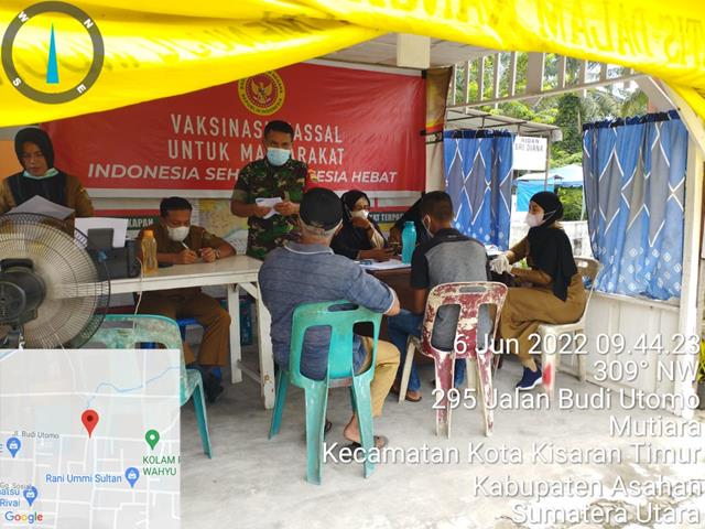 Asahan  |  Kegiatan pendampingan vaksinasi Covid-19 adalah salah satu bentuk dukungan terhadap program pemerintah sebagai upaya keluar dari pandemi Covid-19, mari kita dukung program vaksinasi demi meningkatkan kekebalan daya tahan tubuh warga terhadap serangan Covid-19, seperti halnya yang dilakukan oleh Personel Bintara Pembina Desa (Babinsa) Koramil 06/Kisaran jajaran Kodim 0208/Asahan Serka Syafriman turun kewilayah binaan untuk melaksanakan Pendampingan Vaksinasi Covid-19, bersama dengan Ketua Tim Nakes, dr Khairul Pulungan, Nakes dari Puskesmas Mutiara dan Pasien Vaksinasi, kegiatan tersebut yang dilaksanakan bertempat di Kantor Lurah Mutiara Jalan Budi Utomo Lingkungan I Kelurahan Mutiara Kecamatan Kisaran Timur Kabupaten Asahan, Senin (06/06/2022).