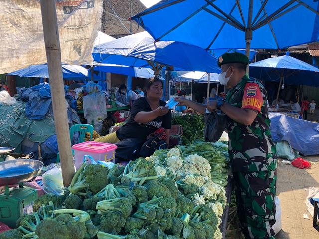 Pematang Siantar | Agar terjalinya hubungan yang harmonis antara TNI dengan masyarakat, untuk menjalin silturahmi bersama dengan warga binaan, dalam hal ini seprti yang dilakukan oleh Personel Bintara Pembina Desa (Babinsa) Koramil 01/Siantar Utara jajaran Kodim 0207/Simalungun Serda Saji turun kewilayah binaan untuk melaksanakan kegiatan PPKM dengan membagikan masker kepada pedagang maupun pembeli dan menghimbau kepada para pedagang maupun pembeli agar tetap mematuhi peraturan pemerintah melaksanakan protokol kesehatan Memakai masker, Menjaga jarak dan mencuci tangan dengan sabun Guna mencegah penyebaran virus Covid-19, kegiatan tersebut yang dilaksanakan bertempat di wilayah Pasar Dwikora Parluasan Jalan Pantuan Anggi Kota Pematang Siantar, Sabtu (04/06/2022).