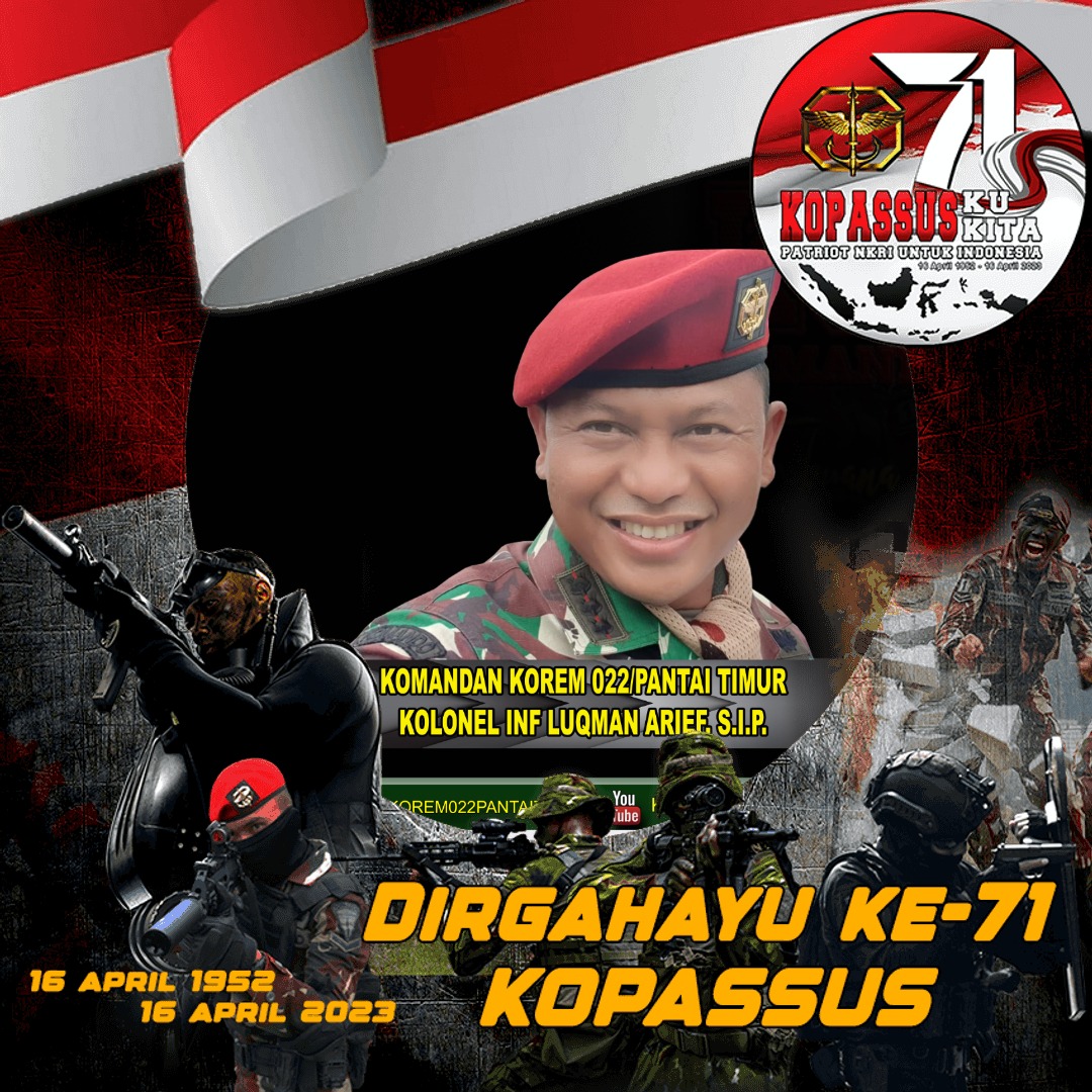 Keluarga Besar Korem 022/Pantai Timur Mengucapkan Dirgahayu Ke-71 Kopassus 16 April 1952 – 16 April 2023