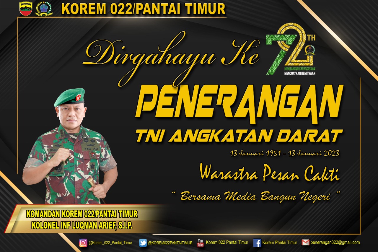 Keluarga Besar Korem 022/Pantai Timur Mengucapkan Dirgahayu Ke-72 PENERANGAN TNI ANGKATAN DARAT 13 Januari 1951 – 13 Januari 2023