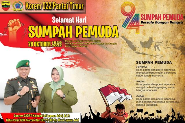 Keluarga Besar Korem 022/Pantai Timur Mengucapkan Selamat Hari SUMPAH PEMUDA “ Dengan Semangat Sumpah Pemuda Mari Kita Bulatkan Tekad Untuk Bersatu Dan Bangkit Demi Bangsa Indonesia “