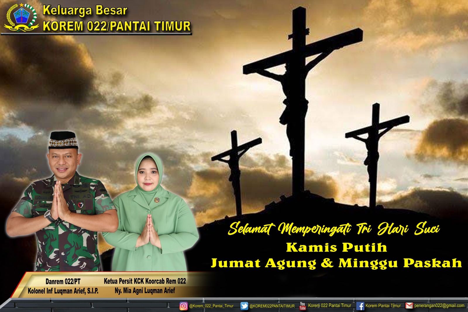 Keluarga Besar Korem 022/Pantai Timur Mengucapkan Selamat Merayakan Tri Hari Suci Kamis Putih, Jum’at Agung & Minggu Paskah.