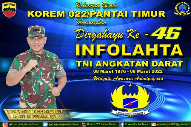 Keluarga Besar Korem 022/PT Mengucapkan Dirgahayu Ke-46, INFOLAHTA TNI-Angkatan Darat, 08 Maret 1976 – 08 Maret 2022, ” Widyuta Awasara Anindyaguna ”