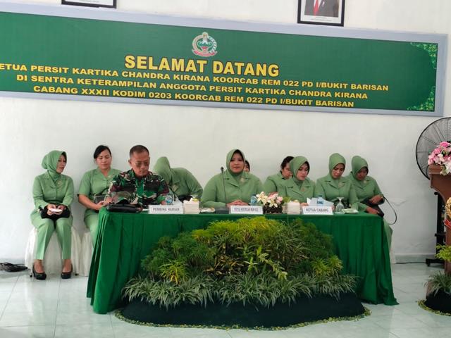 Pematang Siantar  |  Ketua Persit Kartika Chandra Kirana Koorcab Rem 022 PD I/BB Ny. Mia Luqman Arief bersama rombongan di sambut baik oleh Dandim 0203/Langkat Letkol Inf Muhammad Eko Prasetyo di Dampingi Ketua Persit KCK Cab. XXXIII Dim 0203/Langkat Ny. Olki Muhammad Eko Prasetyo dalam rangka peninjauan keterampilan anggota dan bakti sosial, di Makodim 0203/Langkat  Jalan Jend Sudirman No.100, Kartini, Kec. Binjai Kota, Kota Binjai, Sumatera Utara, Selasa (13/09/2022).