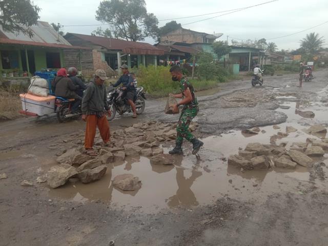 Pada kesempatan tersebut Babinsa Pratu Juna Ishak bersama masyarakat melaksanakan penimbunan jalan yang sering dilalui warga dan memang yang sudah lama rusak, kerusakan jalan tersebut diperparah lagi oleh curah hujan yang cukup tinggi sehingga hampir sepanjang jalan, genangan air menghiasi jalan-jalan yang berlubang. Babinsa Pratu Juna Ishak gerakkan masyarakat untuk bergotong royong untuk menimbun jalan yang rusak agar warga dapat melakukan aktifitasnya sehari-hari dengan lancar karena jalan yang rusak sudah ditimbun menjadi rata kembali.