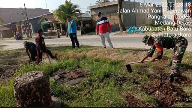 Batu Bara | Guna mewujudkan kemanunggalan TNI bersama rakyat, dalam hal ini seperti yang dilakukan oleh Personel Bintara Pembina Desa (Babinsa) Koramil 03/Lima Puluh jajaran Kodim 0208/Asahan Sertu Indra Sakti turun kewilayah binaan untuk melaksanakan kegiatan Gotong Royong bersama masyarakat Desa Pulau Sejuk membersihkan Parit dan rumput di pinggir jalan dalam rangka untuk menjaga lingkungan tetap bersih dan rapi, bersama dengan Kadus 2 Bapak Sutres dan Masyarakat Desa Pulau Sejuk, kegiatan tersebut yang dilaksanakan bertempat di Dusun 2 Desa Pulau Sejuk Kecamatan Datuk Lima Puluh Kabupaten Batu Bara, Minggu (06/03/2022).