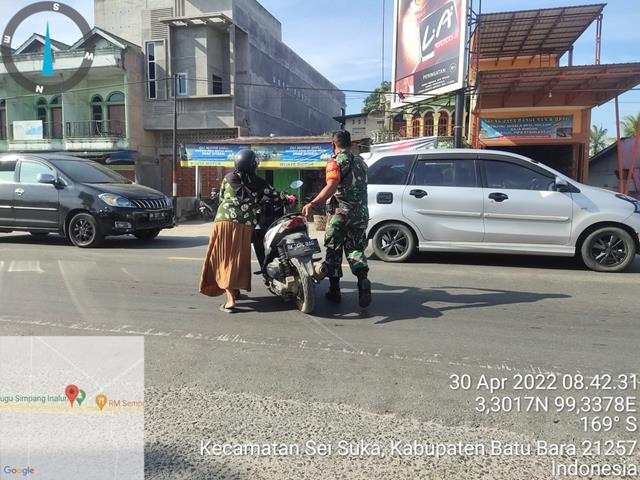 Batu Bara  |  Dlam ragka agar tercipta sinergi kerjasama antara TNI, POLRI dan Intansi terkait dalam pengaman lalu lintas serta penerapan protokol kesehatan bagi masyarakat yang melaksanakan liburan, dalam hal ini seperti yang dilakukan oleh Personel Bintara Pembina Desa (Babinsa) Koramil 01/Medang Deras jajaran Kodim 0208/Asahan Sertu Saut Hs turut serta melaksanakan kegiatan Pos Pam Lebaran Idhul Fitri 1443 H Ops Ketupat Tahun 2022, kegitan tersebut yang dilaksanakan bertempat di Jalan Lintas Sumatera Pos PAM 1 Jalinsum Simp Kuala Tanjung Kecamatan Sei Suka Kabupaten Batu Bara, Sabtu (30/04/2022).