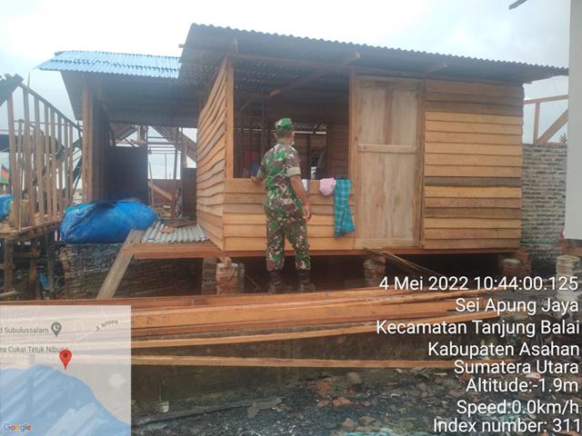 Asahan | Dalam rangka agar terjalinnya hubungan komunikasi yang baik antara Babinsa bersama dengan Masyarakat Desa dalam rangka untuk menciptakan Kerjasama yang baik bersama Masyarakat desa binaan dan Babinsa agar dapat membantu dan mendukung tugas Apter diwilayah binaannya. Dalam hal ini seperti yang dilakukan oleh Personel Bintara Pembina Desa (Babinsa) Koramil 08/Pulau Buaya jajaran Kodim 0208/Asahan Praka Fadli Siagian turun kewilayah desa binaan untuk melaksanakan kegiatan Komunikasi Sosial (Komsos) dengan warga yang sedang melakukan pembangunan rumah kembali pasca kebakaran dengan memanfaatkan bantuan dari baik pemerintah maupun donatur yang diberikan secara langsung demi percepatan pembangunan rumah warga serta monitor atau pemantauan di wilayah pengungsian pasca kebakaran guna mengetahui situasi pengungsi yang berada di tenda bersama dengan Bapak Ikmal Rambe (Kades), Bapak Sondang (Kadus) dan Bapak Zulkifli, kegiatan tersebut yang dilaksanakan bertempat di Jalan Ampera Dusun ll Desa Sei Apung Jaya Kecamatan Tanjung Balai Kabupaten Asahan, Rabu (04/05/2022).