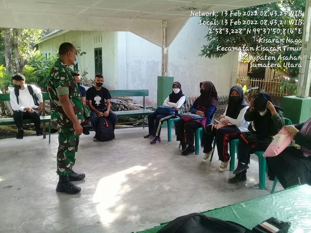 Asahan  |  Dalam memberikan bimbingan dan arahan kepada anggota Pramuka binaan serta mengingatkan tetap pakai masker, cuci tangan dan menjaga jarak guna memutus mata rantai penyebaran virus Corona (Covid-19), dalam hal ini seperti yang dilakukan oleh Personel Bintara Pembina Desa (Babinsa) Koramil 06/Kisaran jajaran Kodim 0208/Asahan Serka Suroso turut serta melaksanakan kegiatan Komunikasi Sosial (Komsos) dan Pembinaan kepada Siswa Pramuka di halaman kantor Koramil 06/Kisaran, kegiatan tersebut yang dilaksanakan bertempat di Jalan K.H.M Yamin Kelurahan Kisaran Naga Kecamatan Kisaran Timur Kabupaten Asahan, Minggu (13/02/2022).