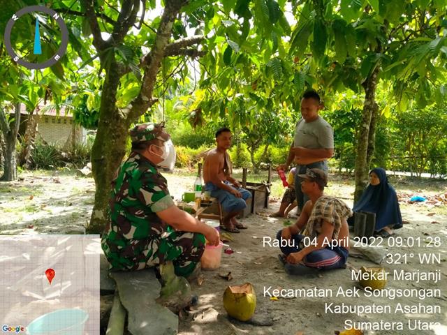 Asahan  |  Dengan rutin melaksanakan komsos sembari berinteraksi dengan warga di desa binaan, maka kita dapat dengan cepat memperoleh segala informasi yang sedang berkembang ditengah-tengah masyarakat, seperti halnya yang dilakukan oleh Personel Bintara Pembina Desa (Babinsa) Koramil 15/Bandar Pulau jajaran Kodim 0208/Asahan Serda Zulkifli Hutapea turun kewilayah binaan untuk melaksanakan kegiatan Komunikasi Sosial (Komsos) bersama dengan Tokoh Pemuda dalam rangka menjalin Kedekatan antara TNI dan Masyarakat dalam suasana lebaran hari raya idul fitri serta berkoordinasi tentang penempatan pos siskamling baru bersama dengan Toko Pemuda Bapak Tino (Kadus), Saudara Ramlan (34 Tahun) dan Saudara Samuji (38 Tahun), kegiatan tersebut yang dilaksanakan bertempat di Dusun 4 Desa Mekar Marjanji Kecamatan Aek Songsongan Kasahan, Rabu (04/05/2022).