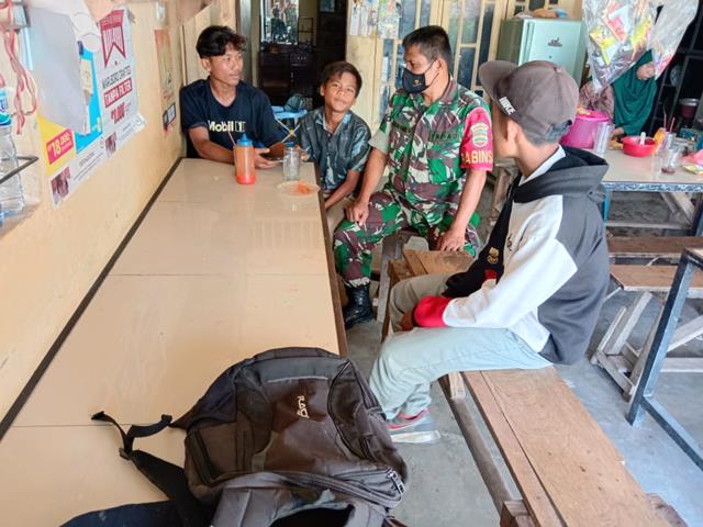 Simalungun | Harapannya Anak Sekolah terutama yang berada dikawasan Kecamatan pulau Leti agar selalu menggunakan masker, menjaga kebersihan, mencuci tangan menggunakan sabun, tidak bekurumun dan menjaga jarak minimal 2 meter, dalam hal ini seperti yang dilakukan oleh Personel Bintara Pembina Desa (Babinsa) Koramil 08/Bangun jajaran Kodim 0207/Simalungun Serka E. Damanik turun kewilayah binaan untuk melaksanakan kegiatan Komunikasi Sosial (Komsos) kepada anak- anak sekolah yang sedang duduk di warung An. Irfan Saragih beserta rekannya adapun topik komsos yaitu tentang penggunaan Sosial Media terutama didalam pembelajaran Daring, kegiatan tersebut yang dilaksanakan bertempat di Nagori Pantoan Maju Kecamatan Siantar Kabupaten Simalungun, Senin (28/03/2022).