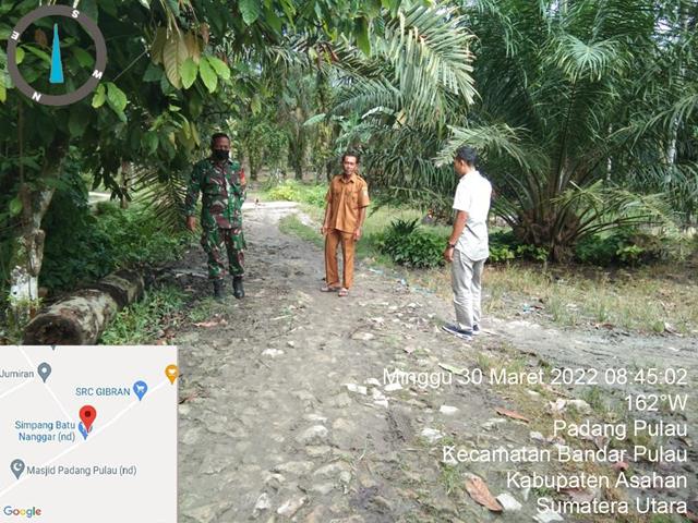 Asahan | Dalam rangka meningkatkan silaturahmi dan hubungan kerja yang baik di wilayah binaanya, pada kesempatan yang baik ini Personel Bintara Pembina Desa (Babinsa) Koramil 15/Bandar Pulau jajaran Kodim 0208/Asahan Sertu Eddy Admojo turun kewilayah binaan untuk melaksanakan kegiatan Komunikasi Sosial (Komsos) bersama dengan Perangkat Desa dan Masyarakat binaan dalam rangka untuk melihat langsung langsung jalan yang rusak banyak berlubang,untuk merencakan gotong royong menimbun jalan yang berlubang dan dalam waktu dekat akan dilaksanakan gotong royong bersama dengan Kadus Dua Bapak Jono, Kaur Desa Bidan Pembagunan, Ibu Saminah dan Masyarakat Binaan, kegiatan tersebut yang dilaksanakan bertempat di Dusun Dua Desa Padang Pulau Kecamatan Bandar Pulau Kabupaten Asahan, Rabu (30/03/2022).