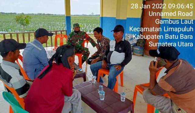 Batu Bara | Dalam rangka meningkatkan sinergitas di wilayah binaanya, dalam hal ini seperti halnya yang dilakukan oleh Personel Bintara Pembina Desa (Babinsa) Koramil 03/Lima Puluh jajaran Kodim 0208/Asahan Serda Sutikno turun kewilayah desa binaan untuk melaksanakan kegiatan Komunikasi Sosial (Komsos) bersama dengan Kepala Dusun 7 Bapak Kasno dan masyarakat Desa Gambus Laut membahas masalah gotong royong jalan tani dan pembenahan saluran air agar para petani dapat memperoleh hasil yang maksimal, kegiatan tersebut yang dilaksanakan bertempat di Desa Gambus Laut Dusun 7 Kecamatan Lima Puluh Pesisir Kabupaten Batu Bara, Jumat (28/01/2022).