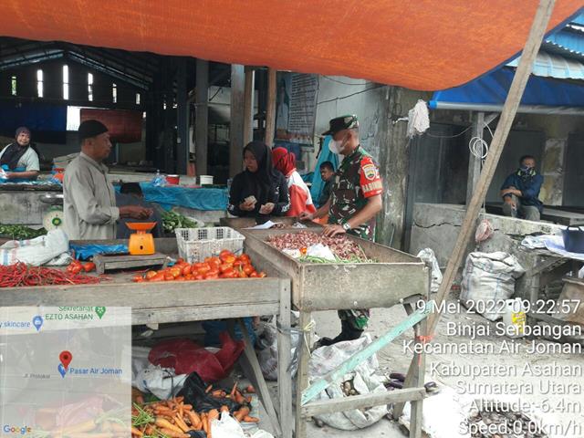 Asahan  |  Guna meningkatkan jalinan komunikasi sosial dengan warga pedagang Semboako diwilayah binaannya, dan mengecek harga sembako sekaligus mengetahui situasi dan kondisi keamanan di sekitar pasar Tradisional diwilayah binaan, dalam hal ini seperti yang dilakukan oleh Personel Bintara Pembina Desa (Babinsa) Koramil 07/Air Joman jajaran Kodim 0208/Asahan Serda Hadi Ismanto turun kewilayah binaan untuk melaksanakan kegiatan Komunikasi Sosial (Komsos) bersama dengan para pedagang sembako/sayur di Pasar Tradisonal yang ada diwilayah binaan, kegiatan tersebut yang dilaksanakan bertempat di Pasar Air Joman Kelurahan Binjai Serbangan Kecamatan Air Joman Kabupaten Asahan, Senin (09/05/2022).