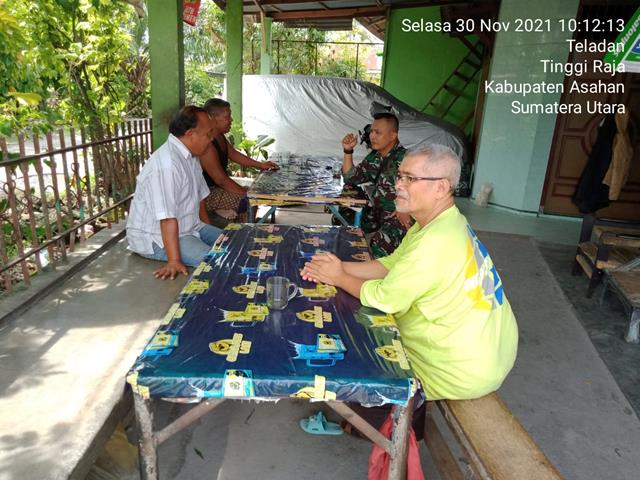 Asahan | Dalam rangka meningkatkan sinergitas di wilayah binaanya, seperti halnya yang dilakukan oleh Personel Bintara Pembina Desa (Babinsa) Koramil 13/Buntu Pane jajaran Kodim 0208/Asahan Serda Bedi Saputra turun kewilayah desa binaan untuk melaksanakan kegiatan Komunikasi Sosial (Komsos) bersama dengan Perangkat Desa dan Mitra Karib agar dapat mengetahui tentang permasalahan serta kondisi sosial di tengah masyarakat dan meningkatkan hubungan yang Harmonis antara Babinsa dengan masyarakat bersama dengan Kadus Dusun lll Bapak Suyatno, Tokoh Pemuda Bapak Fikri dan Tomas Bapak Samsul, kegiatan tersebut yang dilaksanakan bertempat di Desa Teladan Kecamatan Tinggi Raja Kabupaten Asahan, Selasa (30/11/2021).