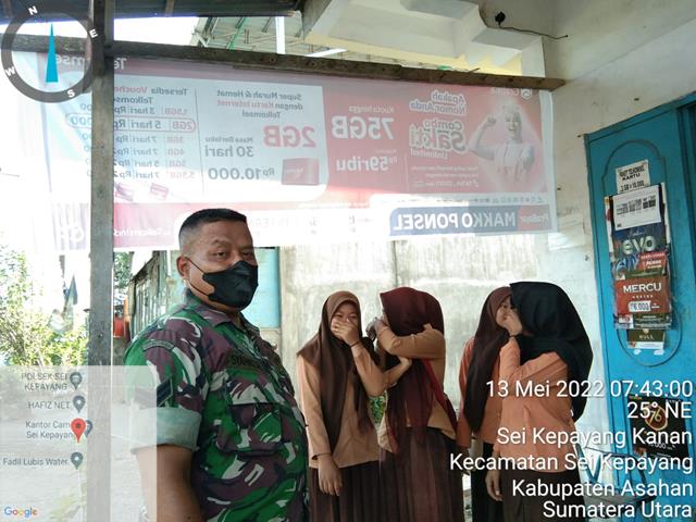 Asahan  |  Dalam upaya memberikan edukasi pencegahan Covid-19, dalam hal ini seperti yang dilakukan oleh Personel Bintara Pembina Desa (Babinsa) Koramil 10/Sei Kepayang jajaran Kodim 0208/Asahan Sertu Syahrizal turun kewilayah binaan untuk melaksanakan kegiatan Komunikasi Sosial (Komsos) bersama dengan anak-anak Sekolah Dasar (SD) Negeri 010013 dalam rangka kegiatan edukasi dan sosialisasi dengan pembagian masker gratis kepada siswa-siswi, kegiatan tersebut yang dilaksanakan bertempat di Dusun 2 Desa Sei Kepayang Kanan Kecamatan Sei Kepayang Kabupaten Asahan, Jumat (13/05/2022).