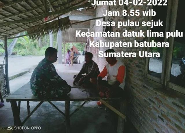 Batu Bara  |  Dalam rangka untuk menjalin silaturahmi dengan para Tokoh Pemuda dan Masyarakat binaan, dalam hal ini seperti halnya yang dilakukan oleh Personel Bintara Pembina Desa (Babinsa) Koramil 03/Lima Puluh jajaran Kodim 0208/Asahan Sertu Indra Sakti turun kewilayah desa binaan untuk melaksanakan kegiatan Komunikasi Sosial (Komsos) bersama dengan Tokoh Pemuda dan masyarakat dalam rangka untuk menghimbau dan mengajak warga agar selalu menjaga keamanan desa, khusus pemuda agar selalu berbuat yang terbaik untuk lingkungan sekitar, contohnya dengan bergotong royong dan yang paling utama jahui Narkoba bersama dengan Kadus 2 Bapak Usman, Tokoh Pemuda Bapak Jepri dan Masyarakat, kegiatan tersebut yang dilaksanakan bertempat di Desa Pulau Sejuk Kecamatan Datok Lima Puluh Kabupaten Batu Bara, Jumat (04/02/2022).