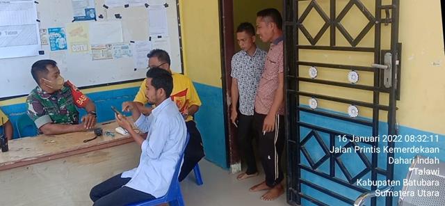 Batu Bara  |  Dalam rangka meningkatkan sinergitas di wilayah binaanya, seperti halnya yang dilakukan oleh Personil Bintara Pembina Desa (Babinsa) Koramil 04/Talawi jajaran Kodim 0208/Asahan Sertu Harianto turun kewilayah binaan untuk melaksanakan kegiatan Komunikasi Sosial (Komsos) bersama dengan Tokoh Masyarakat (Tomas) dan aparat Desa wilayah binaan dalam rangka untuk menjalin silaturahmi, untuk menciptakan dan meningkatkan kerja sama yang baik, dan menjaga silatuhrahmi  antara TNI, dan tokoh masyarakat desa serta untuk menciptakan kemanunggalan TNI dan Rakyat, kegiatan tersebut yang dilaksanakan bertempat di Dusun Melati Desa Dahari Indah Kecamatan Talawi Kabupaten Batu Bara, Minggu (16/01/2022).