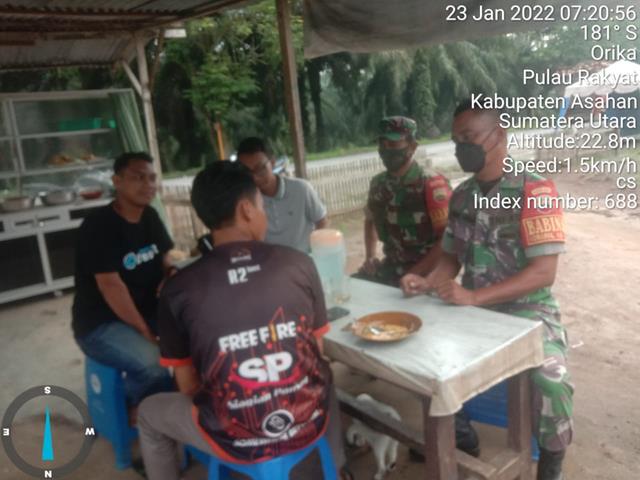 Asahan  |  Dalam rangka agar terjalinnya tali silaturahmi serta komunikasi yang baik antara Babinsa dengan masyarakat Desa binaan, serta dalam rangka untuk menjalin Tali Silahturahmi dalam rangka mempererat hubungan yang harmonis serta membahas kebijakan Pemerintah tentang PPKM Darurat dengan tetap menjaga Kesehatan dalam menghadapi Pandemi Covid-19 bersama dengan warga binaan, Dalam hal ini Personel Bintara Pembina Desa (Babinsa) Koramil 16/Pulau Rakayat jajaran Kodim 0208/Asahan Serka DA. Handoko dan Serda Iswandi Marbun turun kewilayah binaan untuk melaksanakan kegiatan Komunikasi Sosial (Komsos) dengan warga masyarakat binaan sekaligus menghimbau Para Supir yang belum Vaksin agar segera melaksanakan Vaksin bersama dengan Bapak Alan, Bapak Bagio dan Bapak Jaka, kegiatan tersebut yang dilaksanakan bertempat di Dusun 1 Desa Orika Kecamatan Pulau Rakyat Kabupaten Asahan, Minggu (23/01/2022).