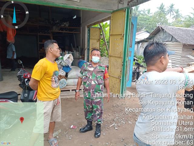 Asahan  |  Komunikasi yang baik antara masyarakat Desa Sei Kepayang Kanan dengan Babinsa Koramil 10/SK sekaligus menghimbau kepada masyarakat agar tetap mematuhi Protokol Kesehatan, dalam rangka untuk menjalin silaturahmi dengan warga binaan, dalam hal ini seperti yang dilakukan oleh Personel Bintara Pembina Desa (Babinsa) Koramil 10/Sei Kepayang jajaran Kodim 0208/Asahan Sertu Rusli Ucok turun kewilayah binaan untuk melaksanakan kegiatan Komunikasi Sosial (Komsos) bersama dengan warga masyarakat Desa Sei Kepayang Kanan, kegiatan tersebut yang dilaksanakan bertempat di Jalan Veteran Dusun ll Desa Sei Kepayang Kanan Kecamatan Sei Kepayang Kabupaten Asahan, Selasa (22/03/2022).