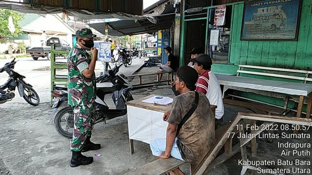 Batu Bara | Salah satu wujud kebersamaan dalam menghadapi musibah pandemic covid 19 di tunjukkan oleh Babinsa diwilayah binaan, seperti halnya yang dilakukan oleh Personel Bintara Pembina Desa (Babinsa) Koramil 02/Air Putih jajaran Kodim 0208/Asahan Sertu Risman turun kewilayah binaan untuk melaksanakan kegiatan Komunikasi Sosial (Komsos) di rumah pak Tamba membicarakan tentang peduli terhadap lingkungan, agar masyarakat jangan buang sampa sembarangan untuk menjaga kebersihan dan kesehatan masyarakat sekaligus Pembagian Masker serta memberikan himbauan dan mengajak Masyarakat agar selalu menggunakan Masker dan mematuhi Protokol Kesehatan bersama dengan Kepling Bapak Tambah, Tomas Bapak Yetno dan Warga Bapak Eka, kegiatan tersebut yang dilaksanakan bertampat di Kelurahan Indrapura Kecamatan Air Putih Kabupaten Batu Bara, Jumat (11/02/2022).
