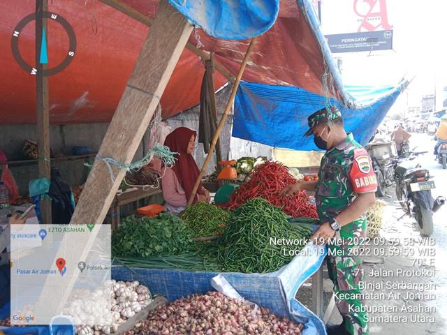 Asahan | Para pengunjung atau konsumen merasa senang dengan adanya himbauan Babinsa karena selalu di ingatkan untuk mematuhi prokes guna memutus penyebaran Virus Covid 19, dalam hal ini seperti yang dilakukan oleh Personel Bintara Pembina Desa (Babinsa) Koramil 07/Air Joman jajaran Kodim 0208/Asahan Serda Eri Susanto turun kewilayah binaan untuk turut serta melaksanakan kegiatan Komunikasi Sosial (Komsos) bersama dengan para pedagang sembako di Pasar Tradisional Air Joman sekaligus memantau harga bahan pokok khususnya di Kec. Air Joman paska perayaan Idul Fitri 1443 H bersama dengan Ibu Misiah (Pedagang) dan Ibu Sumiati (Pedagang), kegiatan tersebut yang dilaksanakan bertempat di Lingkungan lll Kelurahan Binjai Serbangan Kecamatan Air Joman Kabupaten Asahan, Kamis (19/05/2022).