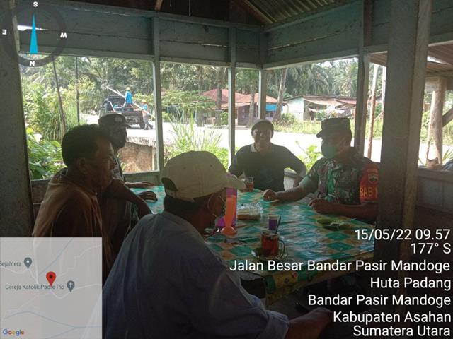 Asahan | Komunikasi Sosial (Komsos) dengan masyarakat di Desa binaannya ini rutin dan berkesinambungan dilakukan untuk mempererat tali silaturahmi dan kerjasama yang baik dalam rangka mendukung tugas pokok Babinsa serta terwujudnya kemanunggalan TNI dengan rakyat, seperti halnya yang dilakukan oleh Personel Bintara Pembina Desa (Babinsa) Koramil 14/Bandar Pasir Mandoge jajaran Kodim 0208/Asahan Serda Joni Tanjung turun kewilayah binaan untuk melaksanakan kegiatan Komunikasi Sosial (Komsos) bersama dengan Mitra Karib melaksanakan Komsos guna memperkokoh hubungan Kekompakan dan Kebersamaan dalam Sinergeritas antara TNI- POLRI bersama rakyat dalam rangka untuk mempererat Hubungan antara Babinsa dan masyarkat agar lebih mudah mendapatkan informasi tentang perkembangan situasi diwilayah tersebut, bersama dengan Babinkamtibmas Aipda Jui Manurung, Bapak Rio Setiawan, Bapak Tonggo Napitupulu dan Bapak Paiyan Purba, kegiatan tersebut yang dilaksanakan bertempat di wilayah Dusun lX Desa Huta Padang Kecamatan Bandar Pasir Mandoge Kabupaten Asahan, Minggu (15/05/2022).