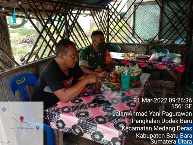 Batu Bara  |  Dalam rangka untuk menjalin silaturahmi dengan petugas kebersihan yang ada diwilayah binaan, dalam hal ini seperti yang dilakukan oleh Personel Bintara Pembina Desa (Babinsa) Koramil 01/Medang Deras jajaran Kodim 0208/Asahan Serma Edy Kurniawan turun kewilayah binaan untuk melaksanakan kegiatan Komunikasi Sosial (Komsos) dengan masyarakat binaan di warung buk Ayar di Kelurahan Pangkalan Dodek dalam rangka menjalin hubungan silaturrahmi yang baik serta membahas tentang kebersihan lingkungan dan mengimbau petugas agar selalu melaksanakan tugas dengan memperhatikan faktor keamanan dan keselamatan diri, adapun tujuan dalam kegiatan komsos yaitu untuk menjalin silahturahmi dengan masyarakat agar semakin akrab hubungan Babinsa dengan warga binaan bersama dengan Ibuk Ayar dan Bapak Indra Lesmana, kegiatan tersebut yang dilaksanakan bertempat di Kelurahan Pangkalan Dodek Kecamatan Medang Deras Kabupaten Batu Bara, Senin (21/03/2022).