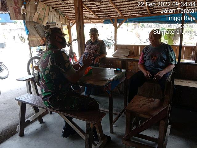 Asahan  |  Untuk mempererat hubungan silaturahmi yang baik antara Babinsa dengan aparat Kelurahan serta masyarakat, dalam hal ini seperti yang dilakukan oleh Personel Bintara Pembina Desa (Babinsa) Koramil 13/Buntu Pane jajaran Kodim 0208/Asahan Serda Ponimin turun kewilayah binaan untuk melaksanakan kegiatan Komunikasi Sosial (Komsos) bersama dengan warga Masyarakat desa binaan agar terjalin hubungan Komunikasi yang baik dengan Warga Masyarakat dengan Babinsa serta agar cepat mendapatkan info jika ada musibah bencana alam dan lain-lainnya dan dalam rangka membahas tentang keamanan lingkungngan yang sedang maraknya kehilangan serta agar berhati-hati setiap bepergian sekaligus menghimbau untuk selalu mematuhi Prokes dalam rangka meminimalisir Penyebaran Pandemi Covid-19, kegiatan tersebut yang dilaksanakan bertempat di Dusun 1A Desa Sumber Harapan Kecamatan Tinggi Raja Kabupaten Asahan, Selasa (22/02/2022).