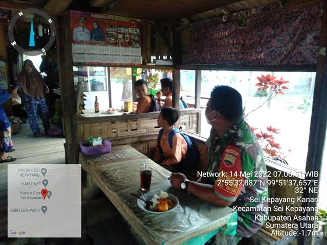 Asahan  |  Dalam rangka agar terjalinnya hubungan yang baik dan Harmonis antara Babinsa Koramil 10/SK dengan anak murid sekolah Dasar Desa Sei Kepayang Kanan, untuk upaya memberikan edukasi pencegahan Covid-19, dalam hal ini seperti yang dilakukan oleh Personel BIntara Pembina Desa (Babinsa) Koramil 10/Sei Kepayang jajaran Kodim 0208/Asahan Serma Supriono turun kewilayah binaan untuk melaksanakan kegiatan Komunikasi Sosial (Komsos) bersama dengan anak sekolah Dasar Desa Sei Kepayang Kanan dan menghimbau kepada Murid agar tetap mematuhi Protokol Kesehatan, kegiatan tersebut yang dilaksanakan bertempat di Warung  Bapak  Budi Jalan Tanjung Balai-Tanjung Ledong Dusun 2 Desa Sei Kepayang Kanan Kecamatan Sei Kepayang Kabupaten Asahan, Sabtu (14/05/2022).