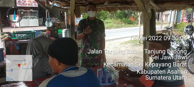 Asahan  |  Agar warga masyarakat tdk was-was melaksanakan ikut program pemerintah Untuk suntik vaksin 19 serta untuk menjalin silaturahmi yang baik dengan warga desa binaan, dalam hal ini seperti yang dilakukan oleh Personel Bintara Pembina Desa (Babinsa) Koramil 10/Sei Kepayang jajaran Kodim 0208/Asahan Serda Dedy Surya turun kewilayah desa binaan untuk melaksanakan kegiatan Komunikasi Sosial (Komsos) bersama warga Desa Sei Jawi Jawi dalam rangka agar terjalinnya hubungan komunikasi yang baik serta mempererat talisilaturrahmi dengan warga masyarakat Desa guna menciptakan suasana aman, damai dan tentram, serta dengan memberi arahan agar tetap menjaga kesehatan dan memakai masker dalam berjualan dimasa pandemi Covid-19, kegiatan tersebut yang dilaksanakan bertempat di Jalan Tanjung Balai-Tanjung Ledong Desa Sei Jawi Jawi Kecamatan Sei Kepayang Kabupaten Asahan, Kamis (12/05/2022).