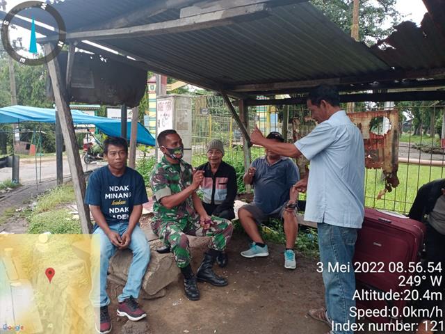 Pada kesempatan yang ada Babinsa Serda I. Marbun mendatangi warga binaan dan beberapa orang lainnya yang berada di luar rumah agar selalu waspada terhadap covid 19 dan berperilaku hidup bersih,dimanapun berada, kegiatan tersebut di Laksanakan di agar masyarakat selalu patuh terhadap protokol kesehatan yang di Galakkan oleh pemerintah Setempat, ungkap Babinsa Serda I. Marbun.
