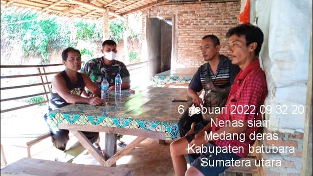 Batu Bara  |  Mengesampingkan rasa lelah dan bosan dalam melaksanakan tugas untuk menekan penyebaran Covid-19, dalam hal ini seperti yang dilakukan oleh Personel Bintara Pembina Desa (Babinsa) Koramil 01/Medang Deras jajaran Kodim 0208/Asahan Serda Supriadi turun kewilayah binaan untuk turut serta melaksanakan kegiatan Komunikasi Sosial (Komsos) bersama dengan warga desa binaan Bapak Samsul serta menghimbau Penegakan Disiplin Protokol Kesehatan dan mengingatkan kepada masyarakat supaya memakai masker di wilayah desa binaan sertadengan mitra mengingatkan bahwa vaksinasi terus berjalan bagi yang belum vaksin dosis 1 maupun dosis 2 dan akan masuk vaksin ke 3, agar selalu ikuti aturan pemerintah yang telah di tetapkan,agar tetap memakai masker apabila keluar Rumah, kegiatan tersebut yang dilaksanakan bertempat di Desa Sei Rakyat Kecamatan Medang Deras Kabupaten Batu Bara, Minggu (06/02/2022).