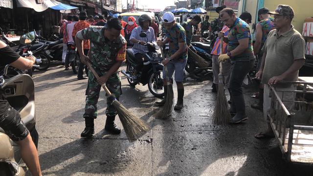 Pematang Siantar – Personel Koramil 01/Siantar Utara Jajaran Kodim 0207/Simalungun bersama Forkopimcam Siantar Utara, Dinas Pasar, Ormas dan warga masyarakat melaksanakan Kegiatan Pembersihan pusat Pasar Dwikora dalam rangka Karya bakti di Parluasan di Jl. Patuan Anggi Kelurahan Baru Kecamatan. Siantar Utara Kota Pematangsiantar.Jumat (8/12/2023).