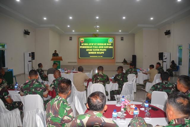 Pada sambutan Danrem 022/PT yang dibacakan oleh Kepala Seksi Operasi (Kasiops) Korem 022/Pantai Timur Letkol Arm Denny Riesta Permana mengatakan  Kegiatan pemberian santunan yang kita laksanakan secara rutin setiap hari Jum’at ini merupakan ungkapan rasa syukur kepada Allah SWT, Tuhan Yang Maha Esa, atas segala limpahan rahmad dan karunia yang telah diberikan-Nya kepada kita semua, sekaligus wujud kepedulian sosial dan ikatan tali kasih yang tulus untuk turut membantu meringankan kebutuhan anak-anak yatim.