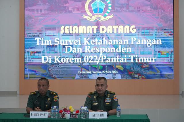 Pematang Siantar – Komandan Korem 022/Pantai Timur Kolonel Inf Tagor Rio Pasaribu S.E., diwakili Pjs Kasrem 022/PT Letkol Inf. Ternalem Sembiring S. Pd menerima kunjungan Tim Survei Internal Kinerja Organisasi Ketahanan Pangan di Wilayah Korem 022/PT TA. 2024 bertempat di Aula Pantai Timur Makorem 022/PT Jln. Asahan, Marihat Baris, Kecamatan Siantar Kabupaten Simalungun. Rabu (29/05/2024).