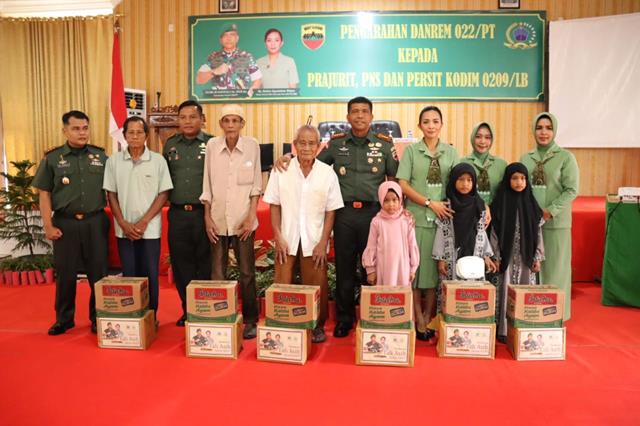 Selesai melaksanakan pengarahan, Danrem 022/PT memberikan Tali Asih kepada Masyarakat Kurang Mampu dan Anak-anak Yatim Piatu.