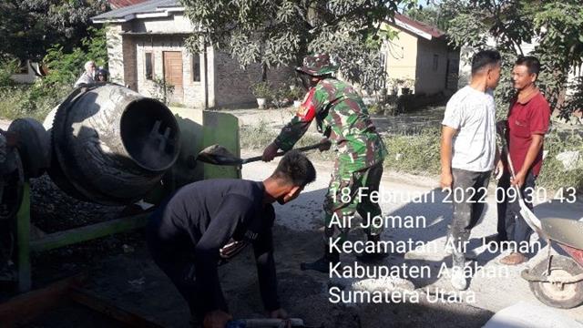 Asahan  |  Wujud kepedulian Babinsa Koramil 07/Air Joman Serka Joni Iwan Priono melaksanakan gotong royong bersama warga masyarakat dengan sasaran pengecoran lantai teras depan Masjid Al-Ikhlas sepanjang 2 X 20 Mtr, kegiatan tersebut yang dilaksanakan bertempat di Dusun II Desa Air Joman, Kecamatan Air Joman, Kabupaten Asahan, Jumat (18/02/2022).